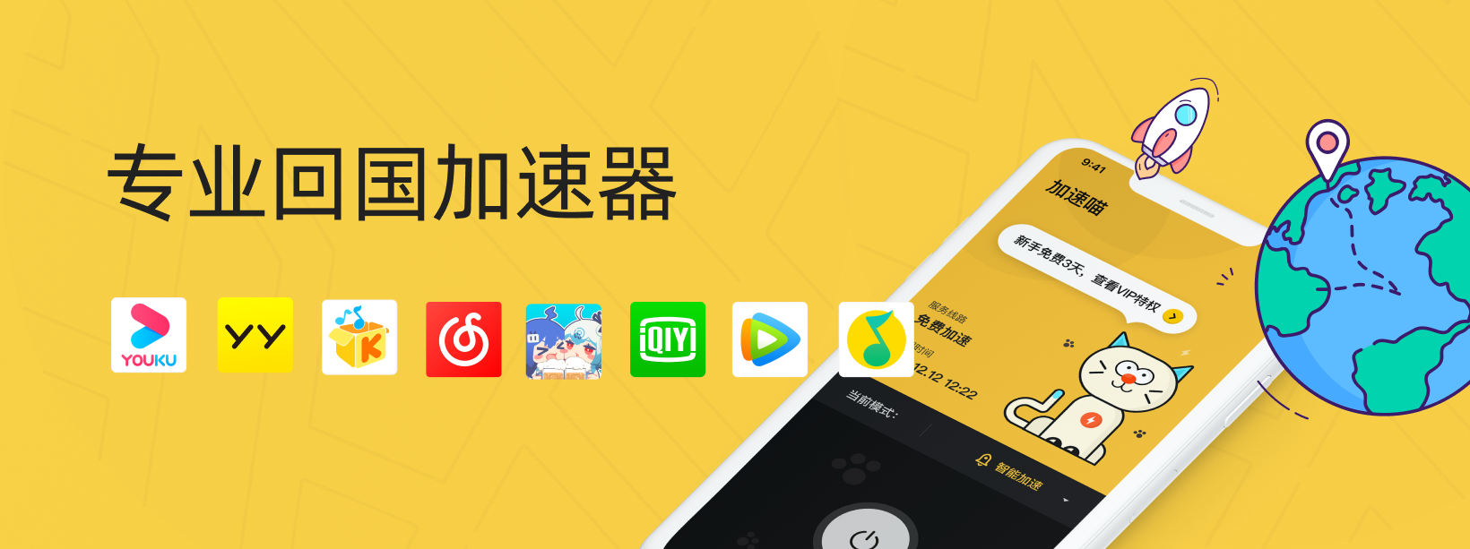 「加速喵」是一款帮助海外华人高速访问中国网络的加速软件。一键穿梭回国,解锁海外地区限制。目前已支持解锁加速的网站和应用有:爱奇艺、优酷、腾讯视频、bilibili、AcFun、芒果TV、酷狗音乐、网易云音乐、QQ音乐、虾米音乐、PPTV体育、腾讯NBA等。