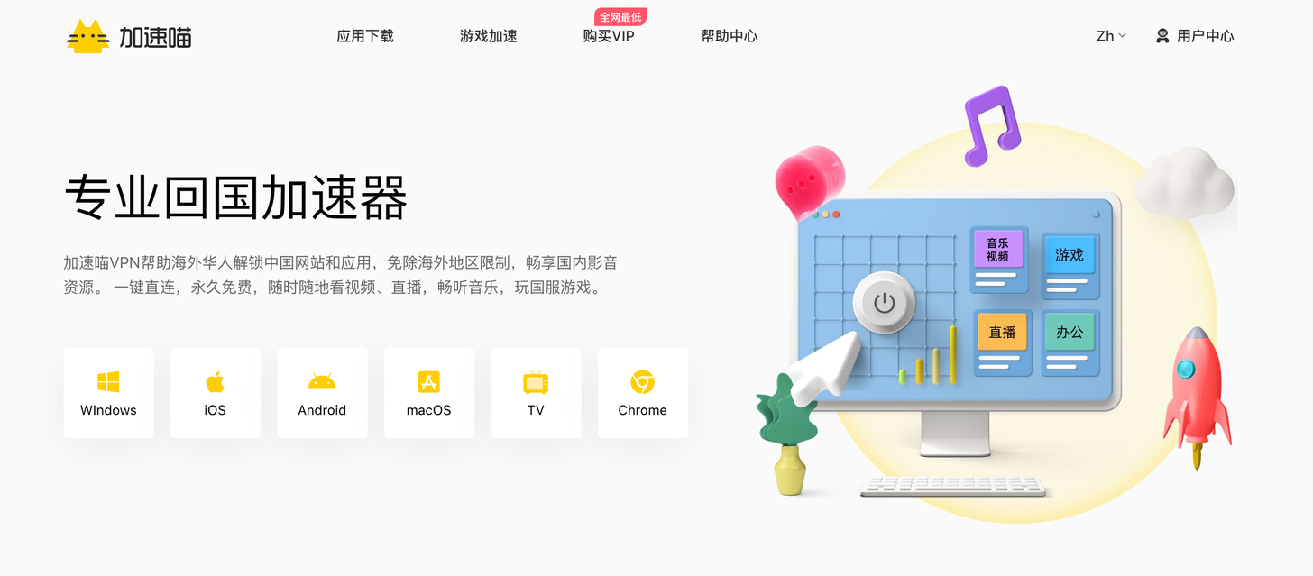 加速喵专门帮助海外华人解决海外地区版权限制,一键回国。支持爱奇艺、优酷、腾讯视频、bilibili、西瓜视频、网易云音乐、QQ音乐、酷狗音乐等影音app。除此之外,还可加速国服游戏,降低海外玩国服的延迟。