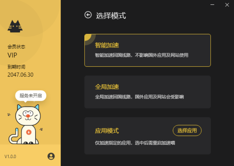 多重模式,满足各种回国场景。除了智能和全局,加速喵特别支持指定应用模式,不妨碍B站直播、YY直播时,影响游戏加速。操作简便,只需要将需要加速的程序快捷方式拖拽至指定应用模式窗口,重启需要加速的应用即可。